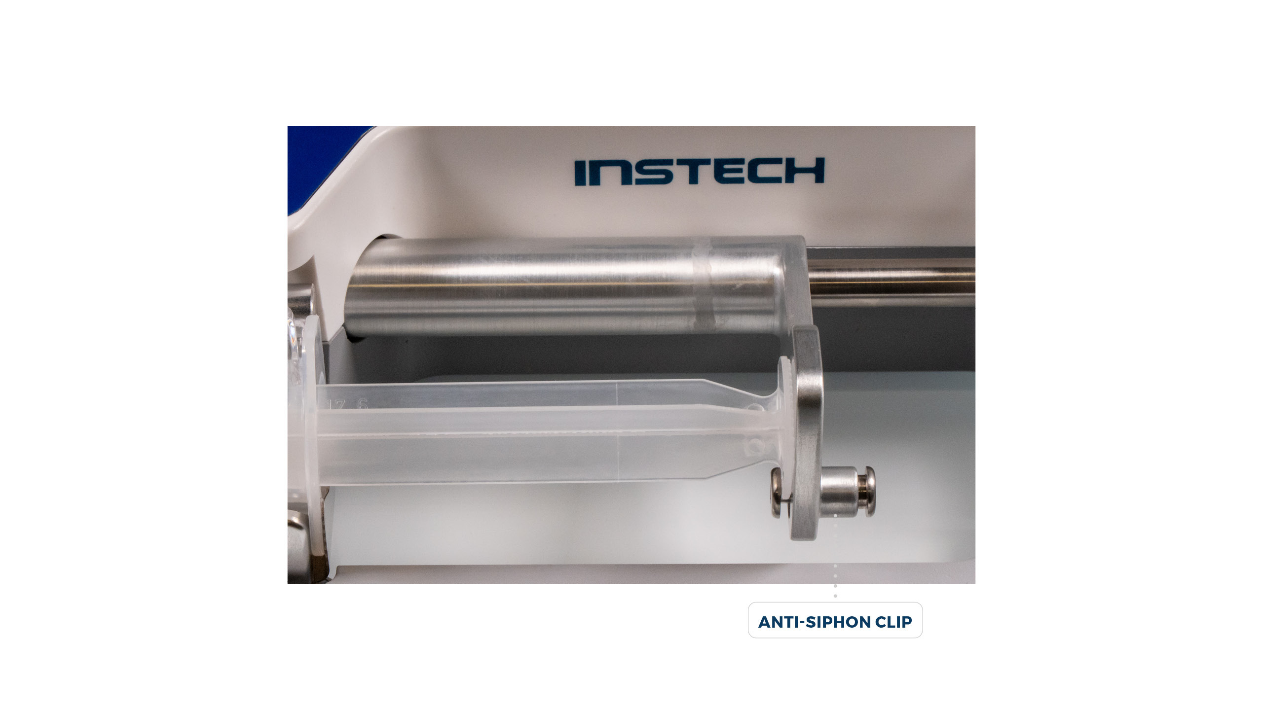 If you are using a large (typically 20mL or larger with BD) or low friction syringe and your output is below the pump it is sometimes possible for gravity to empty your syringe. In these cases, engage the Anti-Siphon clip to hold the plunger as shown. If siphoning is not possible with your setup, do not use the clip.