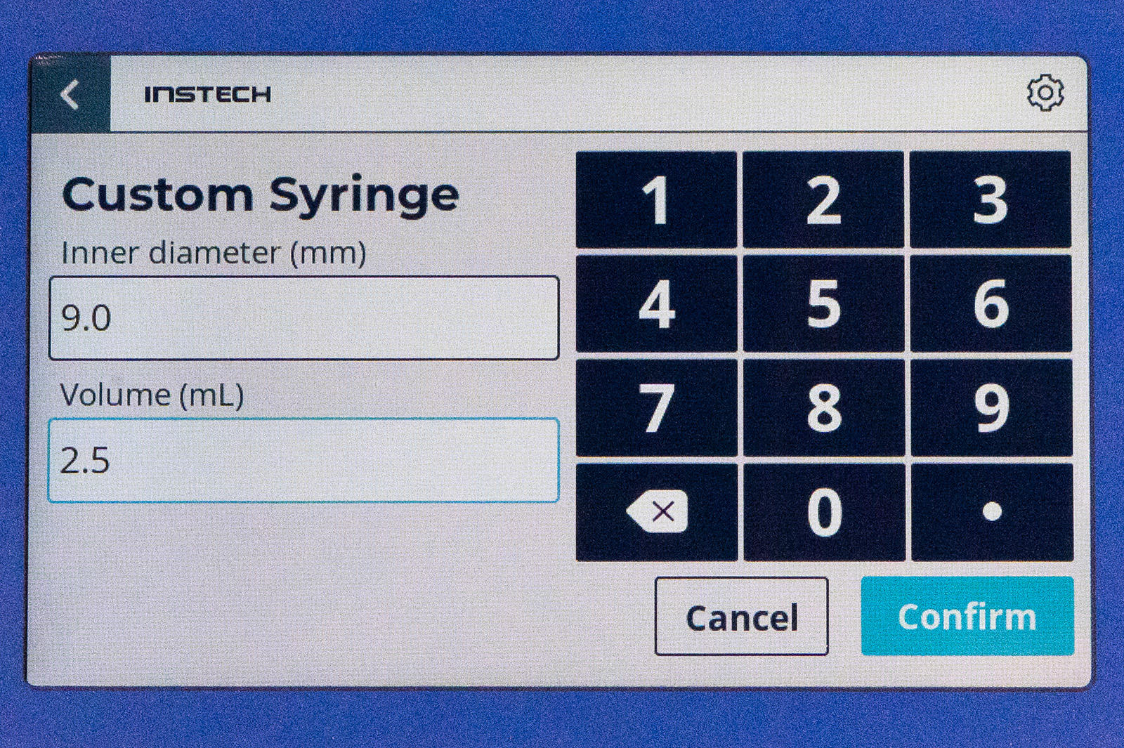 To use a syringe that is not in the library, press the Custom Syringe button. Enter the ID in mm and volume in mL, install the syringe so that the pump can record the outer diameter, and press Confirm. The Pressure Monitor will function with IDs larger than 4mm, but Auto-Close and Auto-Open will be disabled for all custom syringes. You cannot save a custom syringe to the library (library syringes require additional testing), but the syringe will remain active until you change to a different one.