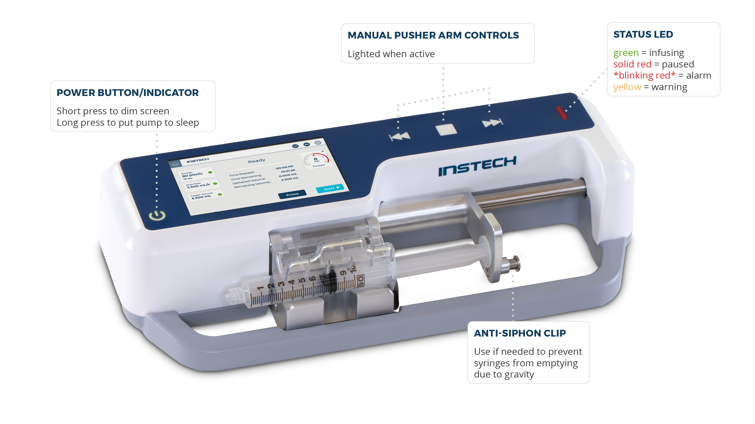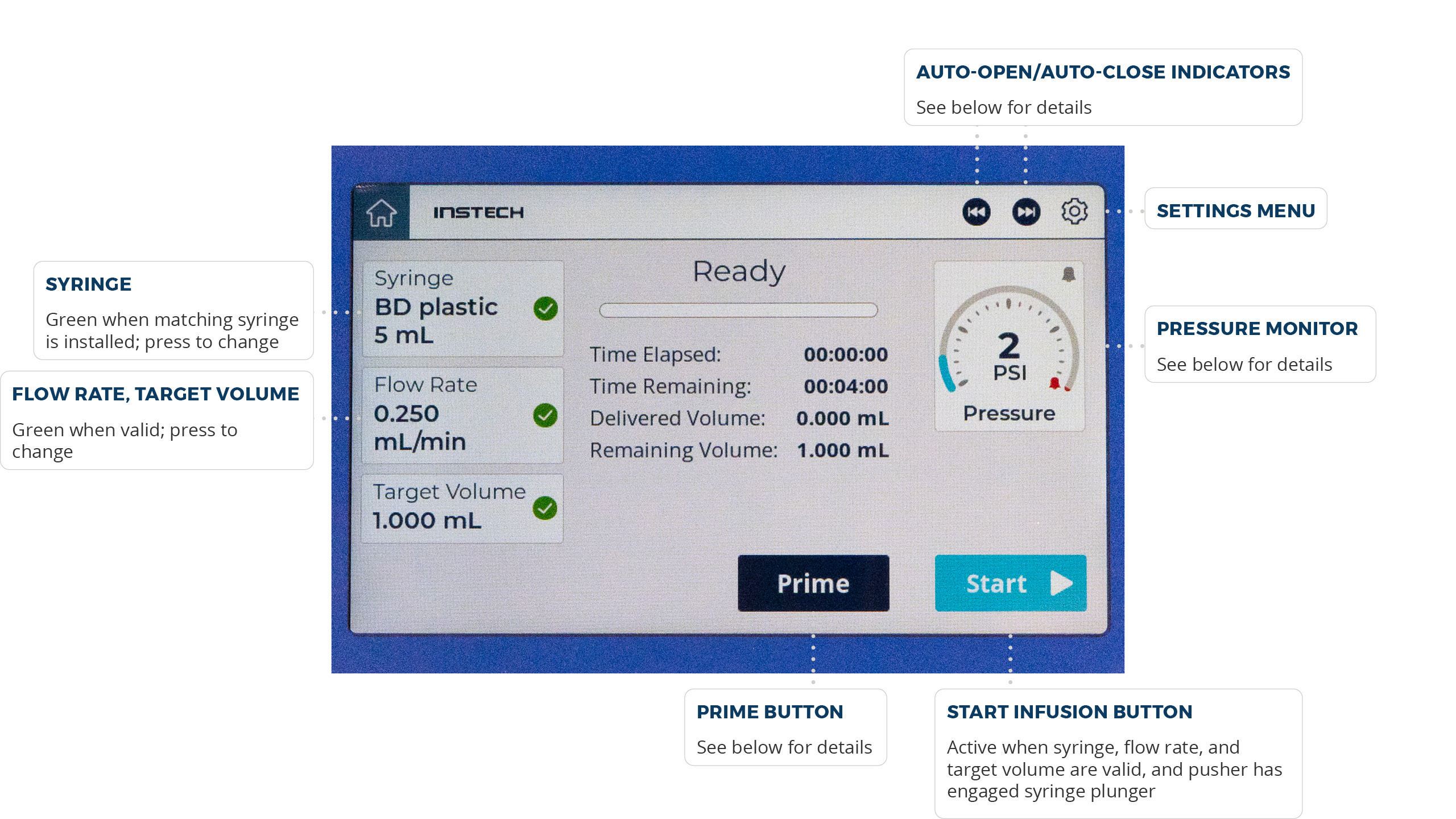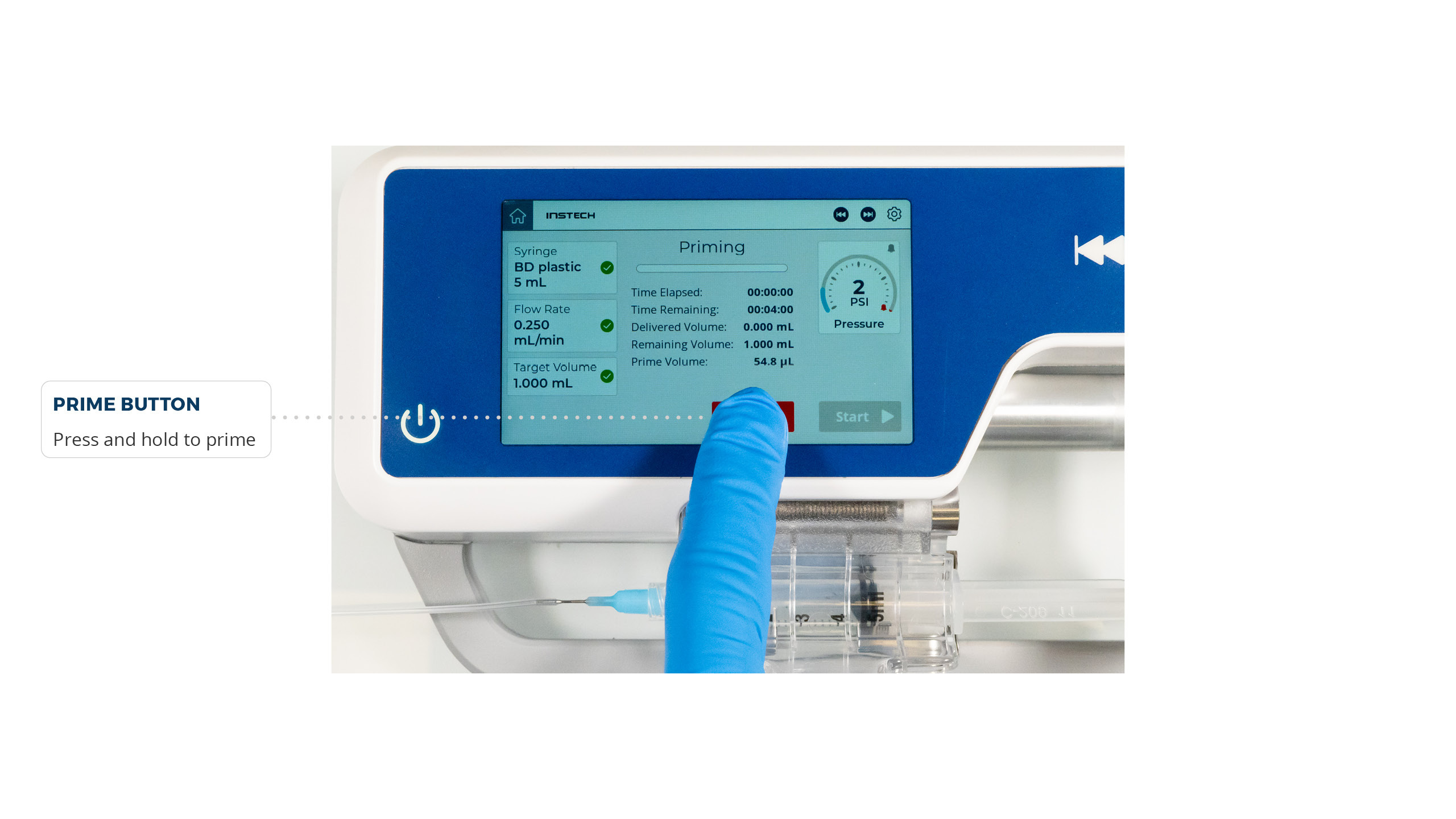 Once the arm has engaged the syringe and you have a valid syringe installed and a valid flow rate and target volume (three green check marks), the Start and Prime buttons will become active.