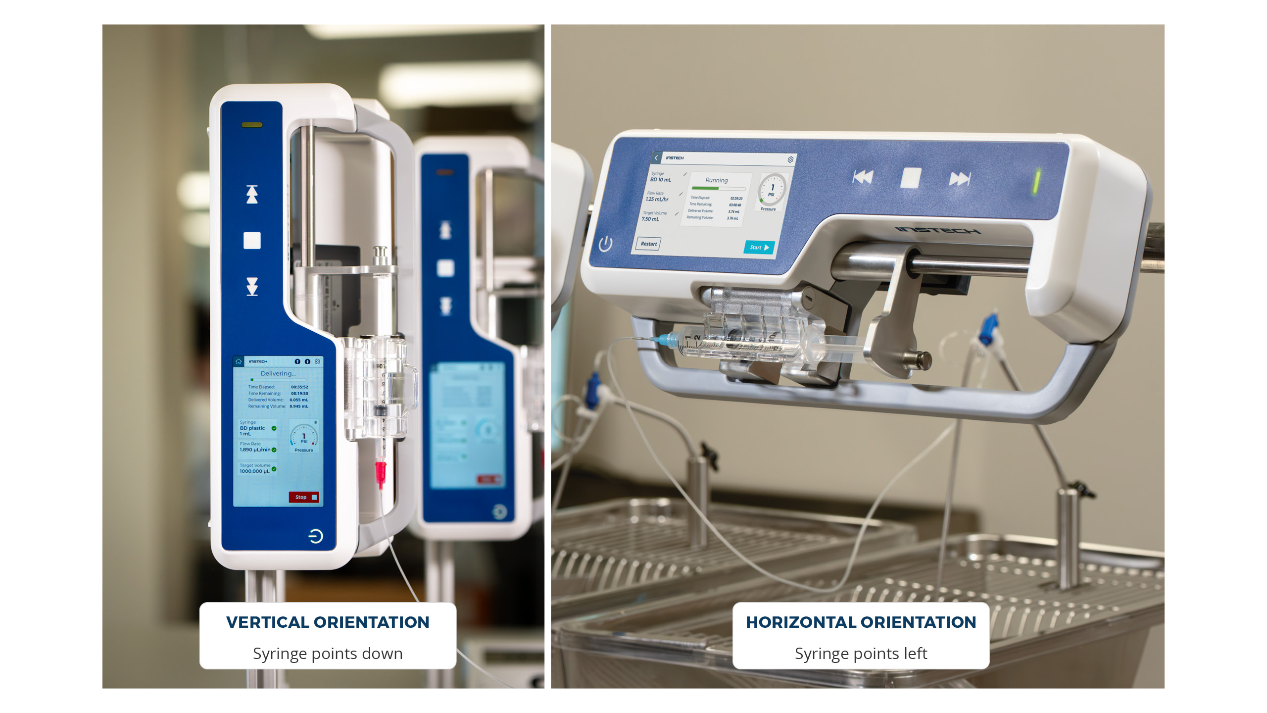The pump can be placed flat on a surface or mounted vertically or horizontally using optional mounting hardware. Change the screen orientation through the Settings menu. When in the Vertical setting the pump should be mounted vertically with the syringe facing down. If you use the Vertical setting with the pump horizontal, or conversely if you use the Horizontal setting with the pump oriented vertically, the pressure monitor may not function properly. Do not mount the pump with the syringe facing up.