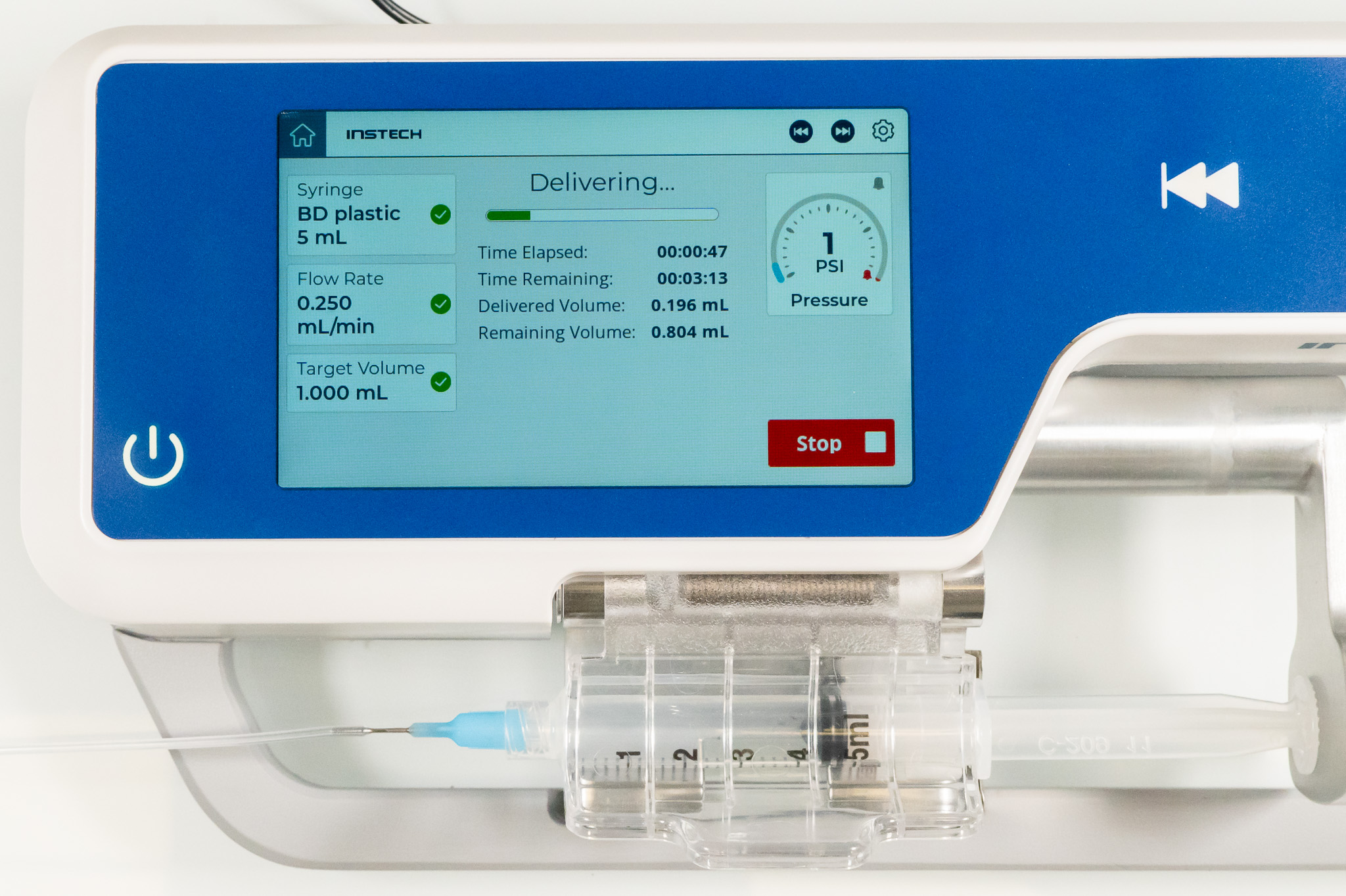 Press on the pressure gauge to set the Pressure Alarm: 10, 15 or 20PSI, or Off. Occlusion alarms are critical for animal safety, to avoid leaks or damage to the infusion set and catheter, and for confidence that the dose was delivered. The 10PSI Low setting will be triggered more quickly than the 15PSI Medium or 20PSI High settings. Syringe friction is included in this reading and friction will be more of a factor with smaller syringes. Choose a higher pressure setting if you are having false alarms; you may find the High setting more useful with 1mL syringes. Note that syringes, particularly those with rubber plungers, can go bad over time and become difficult to move, and in this case it is better to replace the syringe than to increase the occlusion alarm setting. We do not recommend turning the occlusion alarm off when infusing live animals.