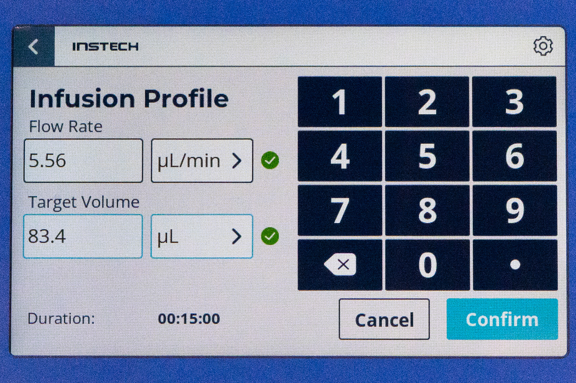 Enter flow rate and target volume in the Infusion Profile screen. Choose flow rate units from mL/min, mL/h, µL/min and µL/h. Volume units will adjust accordingly, and vice versa. Duration is calculated and displayed in hh:mm:ss. You will only be able to confirm the selections if they are within the limits for the syringe you have selected.