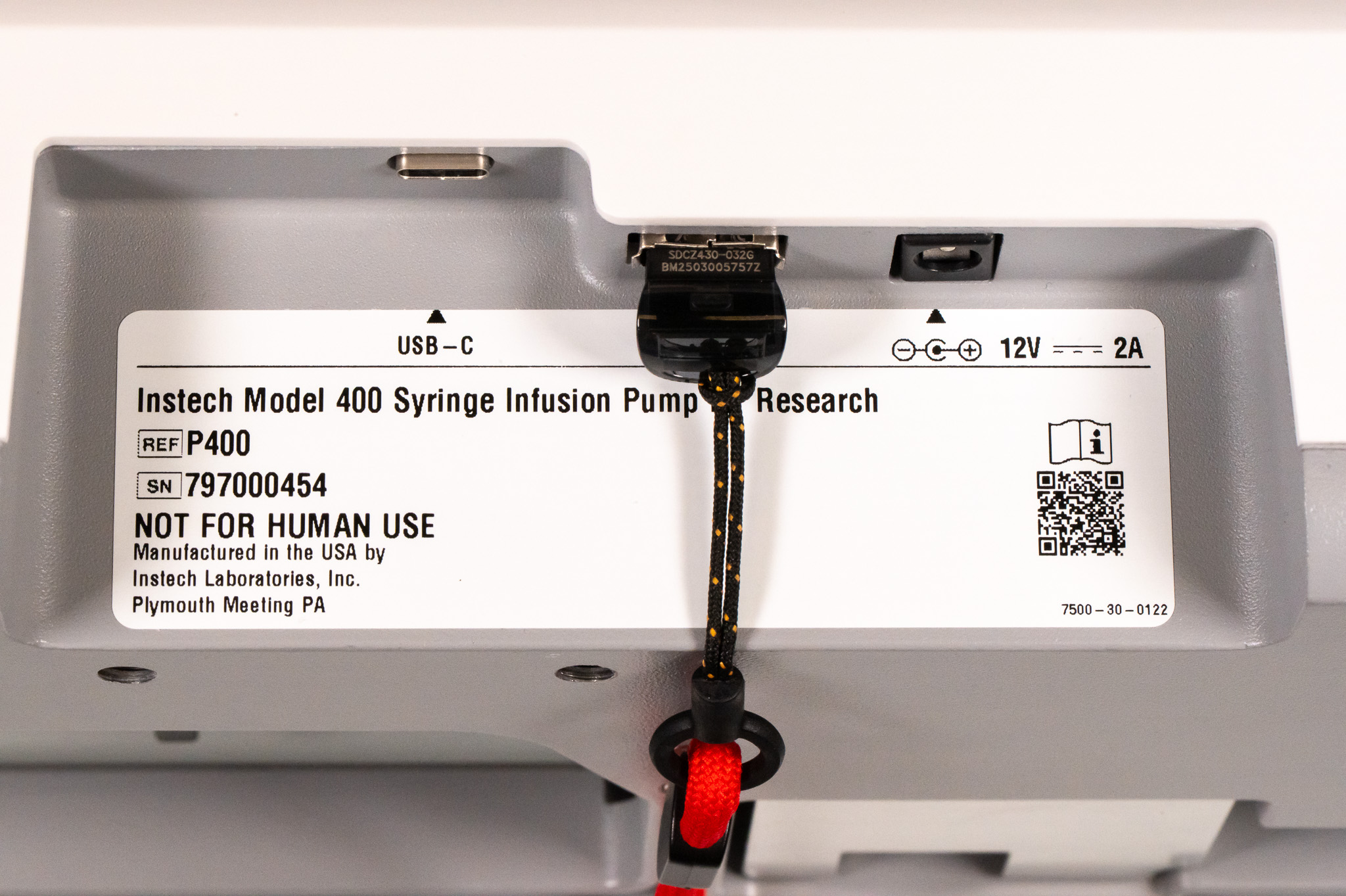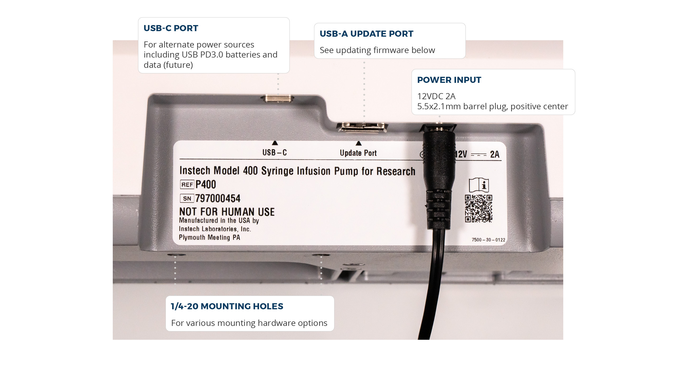 The standard power source is the 12VDC adapter included with the pump. Contact Instech if you need streamlined power cabling for a group of pumps. If you need portability, or are not near AC power, you can run the pump with a small USB PD3.0 battery pack for many hours; plug it into the USB-C connector.