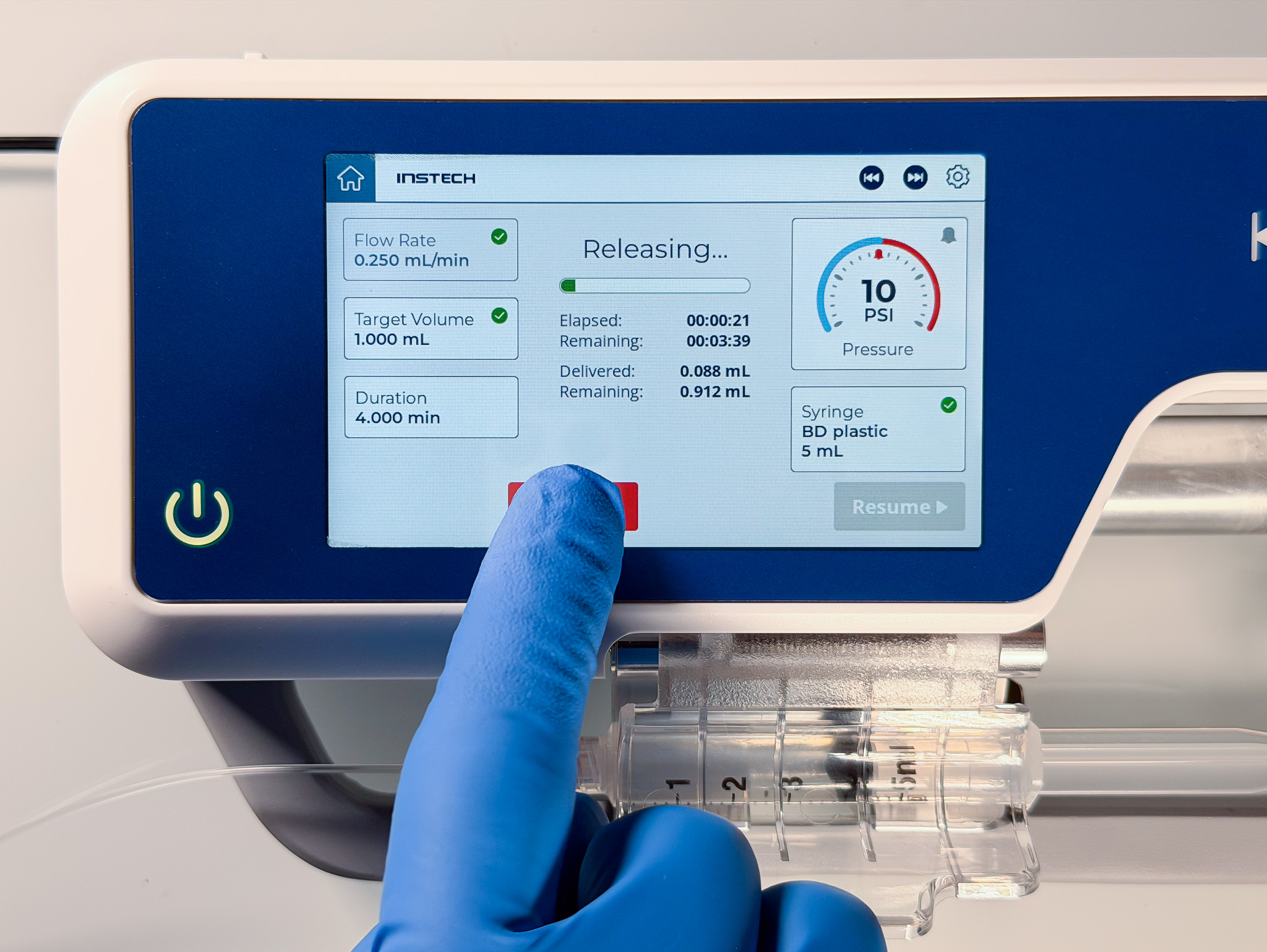 Press either the red Stop button on the screen or the physical stop button if you need to pause in the middle of an infusion. You will be able to Resume where you left off or Cancel to reset time and volume delivered to 0. If you have to disengage the syringe and reengage, you will still be able to Resume so long as you have not changed syringe size.