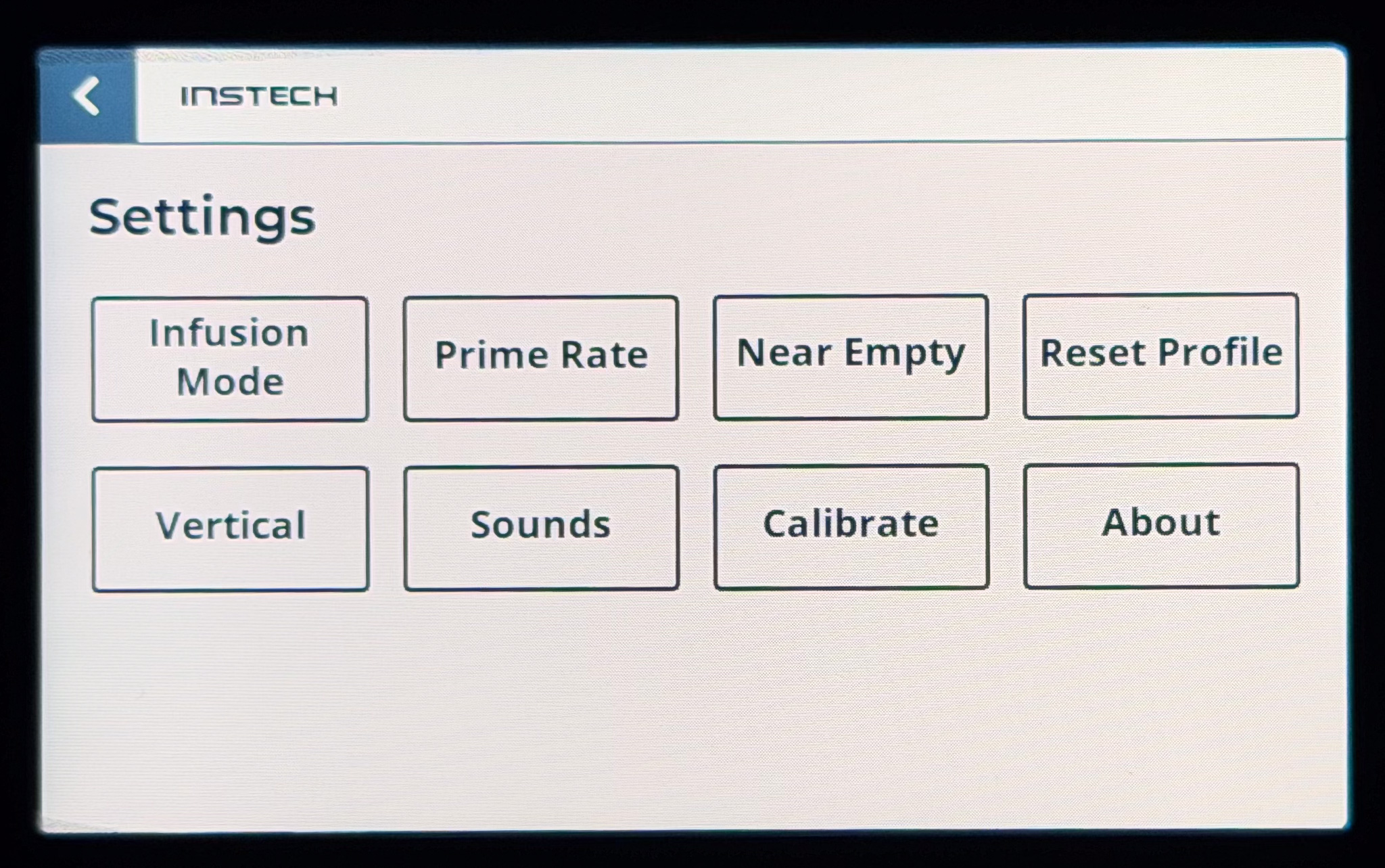 Clears syringe selection and infusion profile settings. Useful if you are finished using the pump and want the next user to start fresh. The pump will start up in the Syringe Selection menu rather than the main screen, and then move directly to Infusion Profile screen once a syringe is selected.